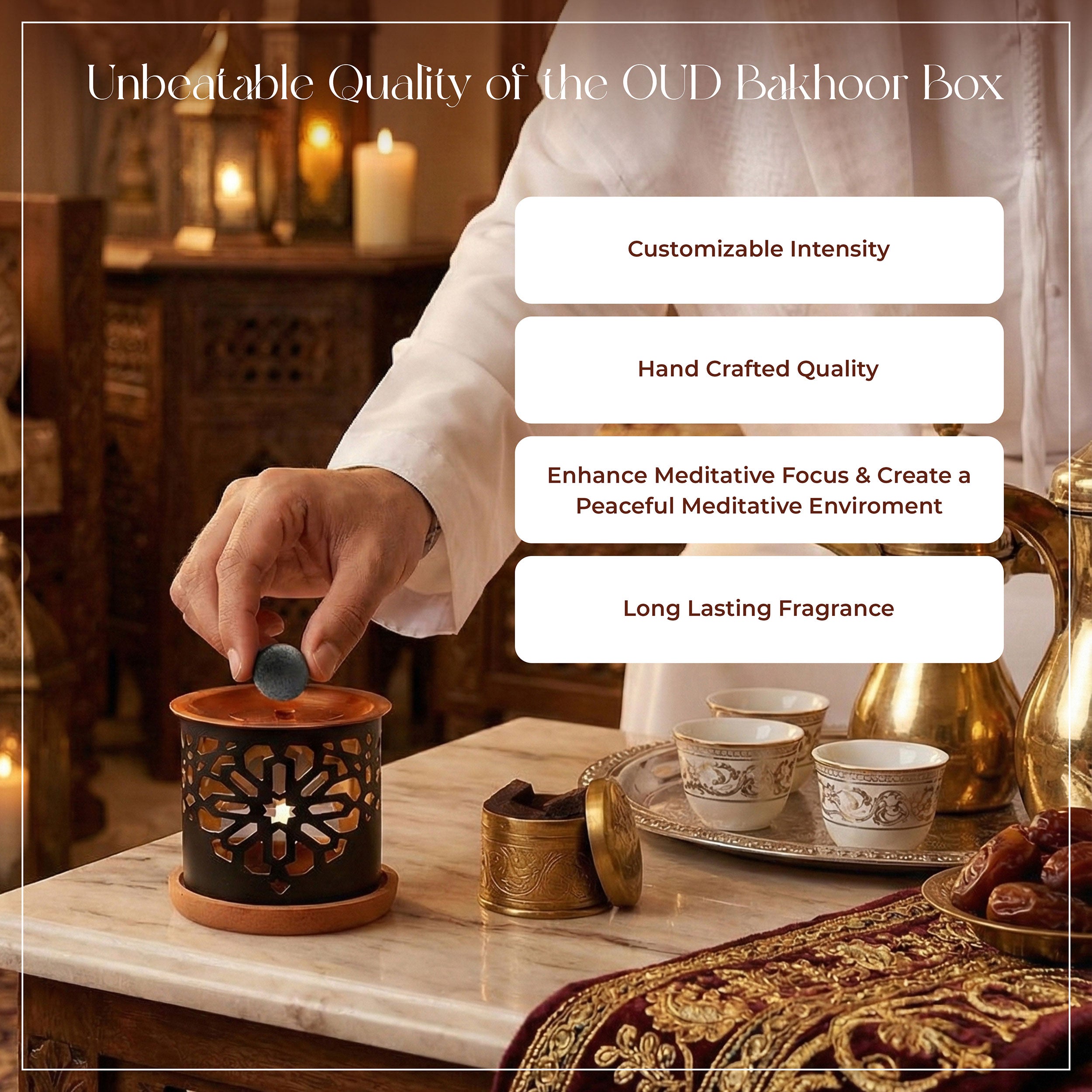 Indulge in spiritual rituals, meditation, relaxation or any special occasions like festive occasions, guests visits or any special moment then the use of BIN-SULEMAN Bakhoor provide you an environment with its pleasant fragrance that elevates your concentration and relaxation ability or gives a special gesture to welcome or celebrate any special moment. It is ideal for spiritual rituals, home fragrance, festive occasions and any special moment.