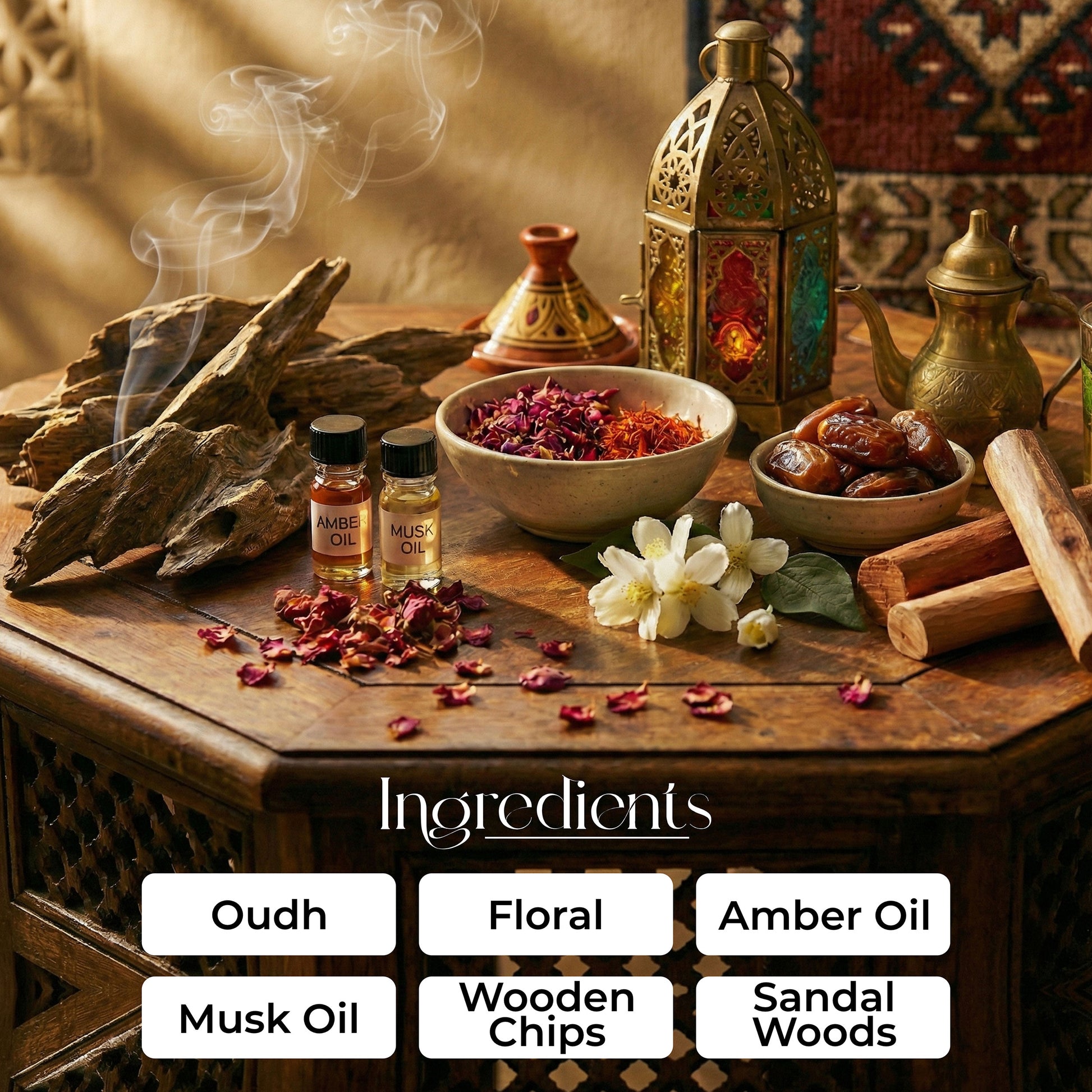 Oudh (Agarwood) – The base of the fragrance, deeply resinous and woody