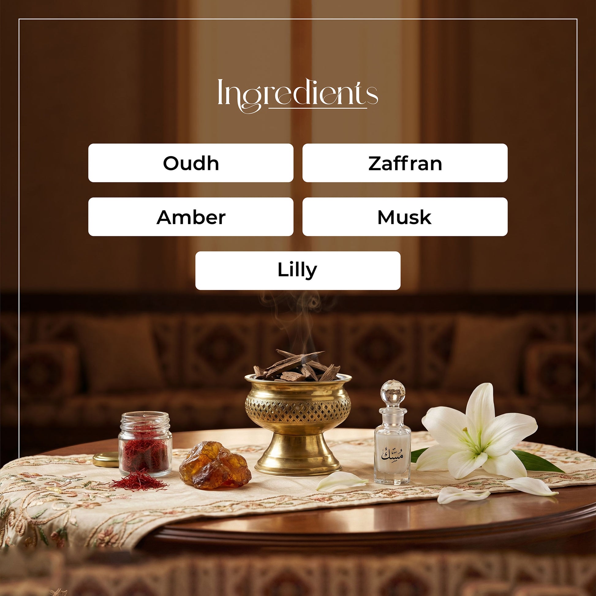 ✅ Oudh (Agarwood) – The base of the fragrance, deeply resinous and woody