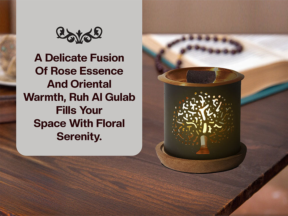 Floral Notes – A dominant infusion of Rose (Gulab) complemented by subtle accents of Jasmine and Saffron, with balancing hints of Patchouli or Cedarwood