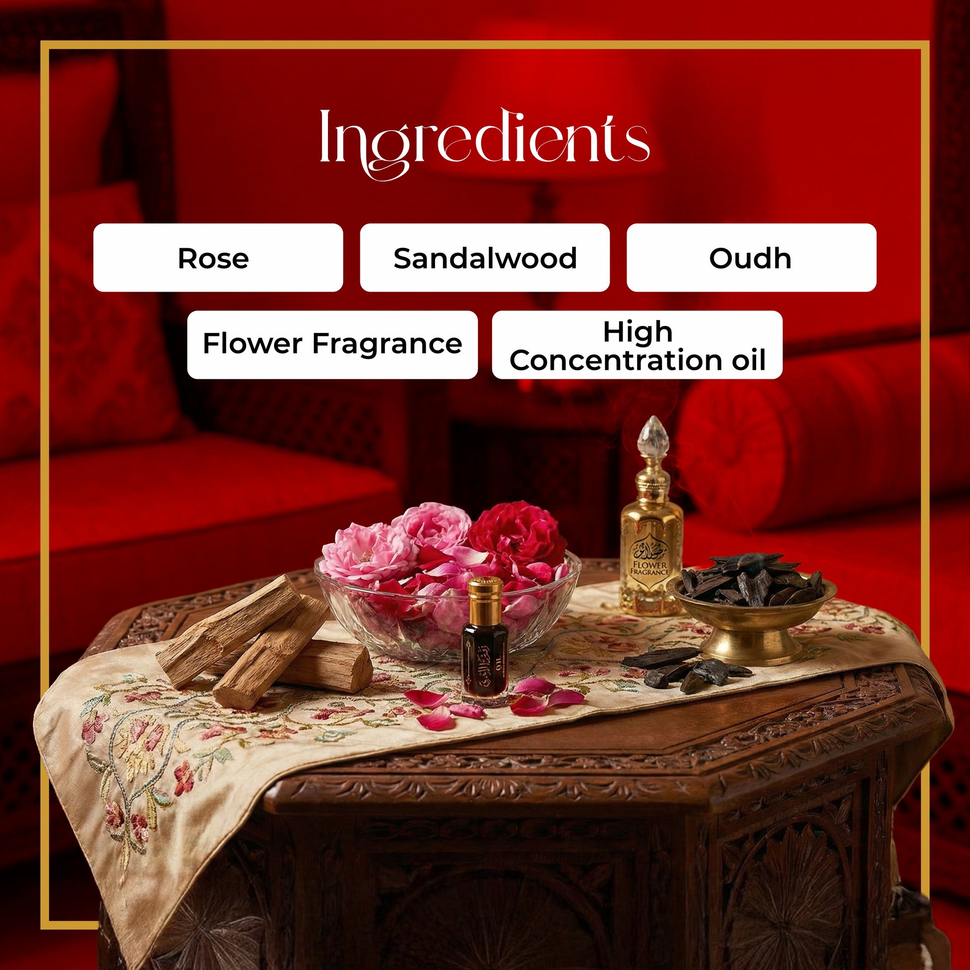 ✅ Floral Notes – A dominant infusion of Rose (Gulab) complemented by subtle accents of Jasmine and Saffron, with balancing hints of Patchouli or Cedarwood